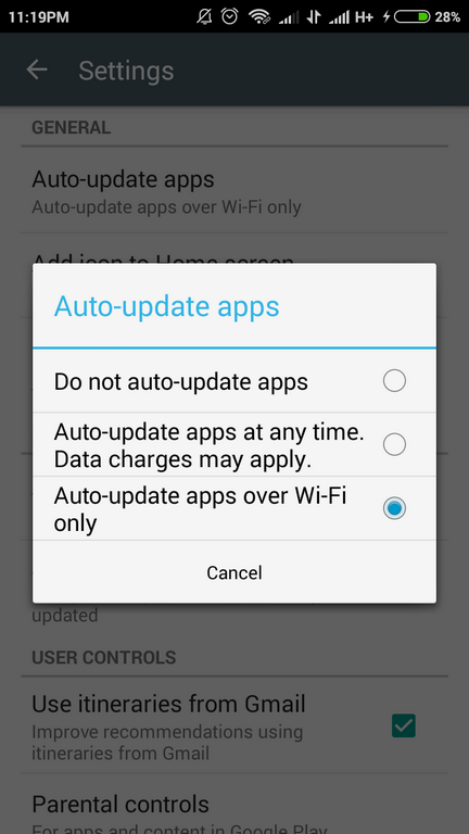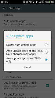 Aplikasi android sebagian besar bersifat auto update. Saat ada koneksi internet, Google play akan mengecek apakah ada versi baru dari aplikasi yang terinstall. Bayangkan anda punya 10 aplikasi dengan ukuran update masing masing aplikasi sebesar 10 MB, maka sekali update saja bisa habis 100 MB. Caranya masuk ke Google play masuk ke menu seting dan Ubah menjadi “Auto update App using Wifi Only” Seperti gambar dibawah ini .