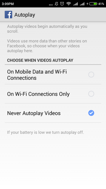 Jika anda menginstall Facebook di Android, pastikan matikan fitur Auto play Video nya. Masuk ke Appseting, Video dan Pilih “Never Auto play Videos“.