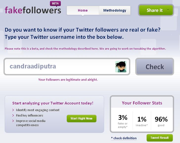 | Hasil pengecekan fakefollower, akun twitter @candraadiputra hanya punya 3% follower palsu. |