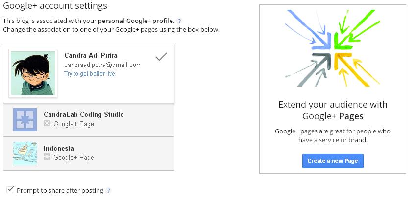 Setting share ke Google+. Kita bisa autoshare ke Profil pribadi atau ke ‘Google+ Page’