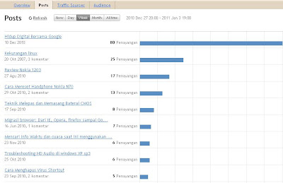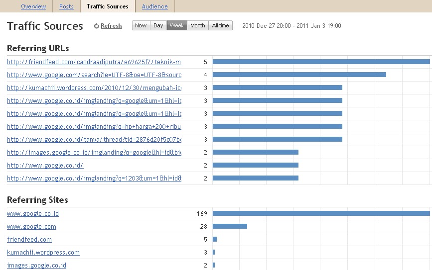 Tab ketiga berisi traffic source, disini kita bisa melihat dari mana asal trafik, ada tiga sub kategori, pertama adalah referring URLS, artinya orang membaca posting kita dari link dan website siapa. yang kedua referring site, orang mengunjungi kita dari website mana , makin banyak blog anda di link oleh pihak lain, makin tinggi referring site nya, dan yang terakhir (Tidak terlihat di gambar) adalah Search keyword artinya ketika seseorang mencari Artikel di mesin pencari dan akhirnya sampai ke blog anda itu menggunakan keyword apa cool and detail banget kan.