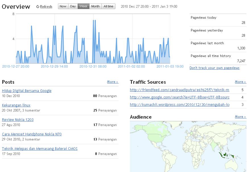 tab ini berisi ringkasan dari statistik secara keseluruhan, anda bisa melihat trafit saat ini, harian ataupun bulanan, di tab ini juga terdapat ringkasan post atau artikel yang paling banyak diakses sekaligus dari negara mana para pengunjung blog kita berasal.