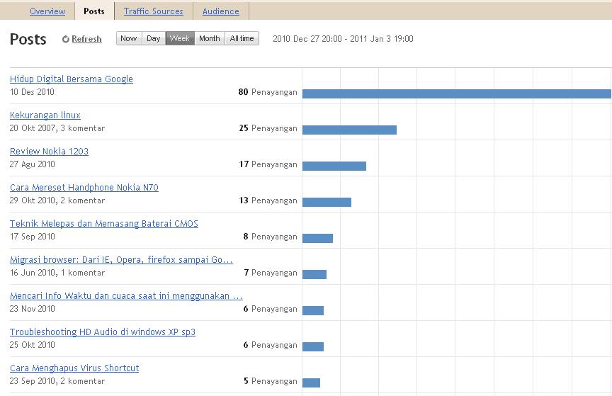 Tab kedua adalah tab Post, disini kita bisa melihat secara rinci, halaman dan posting apa yang paling sering diakses oleh user, dalam tampilan diatas, terlihat bahwa postingan “Hidup digital bersama Google” adalah posting yang paling banyak pengunjungnya dalam minggu ini.