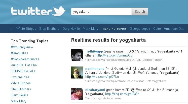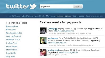 Twitter sekarang menjadi patokan Trend berita dan info terkini, baik itu event, berita dan kejadian di dunia atau disuatu negara. Namun jika anda ingin meliat info terkini di kota /daerah anda anda bisa memanfaatkan fitur pencarian twitter , sebagai contoh, misalkan anda tinggal di yogyakarta, di twitter search ketik saja Yogyakarta,