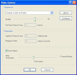 Agar ukuan file AVI tidak terlalu besar, anda bisa menyesuaikan setting video di menu Options->Video Options.Kemarin sebelum saya mensetting video options, baru merekam video 1 menit, ukuran file sudah mencapai 1,1 GByte. Namun setelah video option saya atur ulang, untuk merekam video 3 menit hanya menghasilkan file avi sebesar 70an Mega Byte.