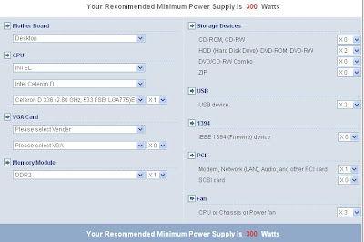 Tadi pagi, iseng iseng browsing, Rencananya mencari update Firmware dari DVD-RW ASUS 2014L1T yang ga mau burning, Tapi malah mendapat info tambahan tentang berapa Watt PSU minimal buat komputer kita. Caranya kita cukup memasukan semua informasi Hardware yang kita punya dan pilih seri atau model serta jumlahnya.