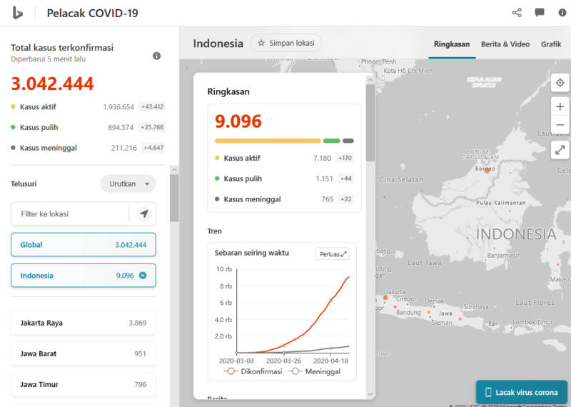 Anda juga bisa langsung membuka halaman diatas dengan mengetik “coronavirus” di mesin pencari Bing.com.