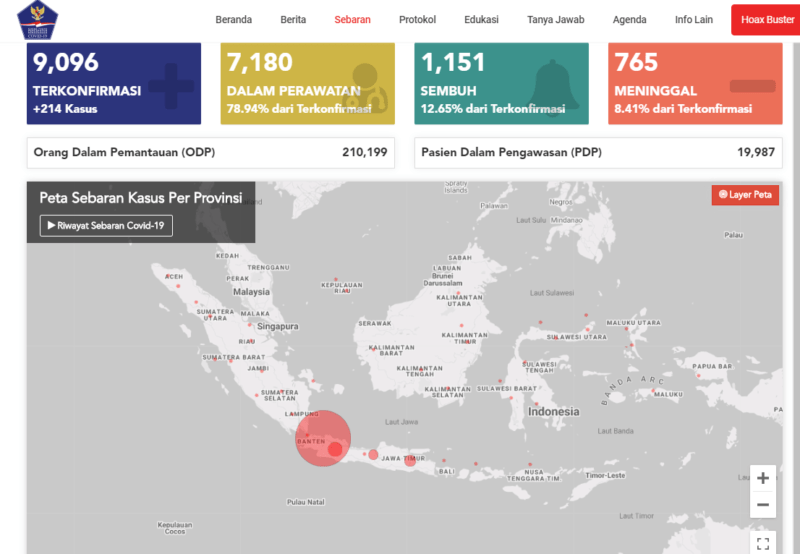 Halaman resmi dari Pemerintah Indonesia. Halaman ini berisi statistik resmi yang menjadi rujukan hampir semua media pemberitaan nasional. petanya ada di menu Sebaran atau anda bisa langsung klik di link https://covid19.go.id/peta-sebaran.