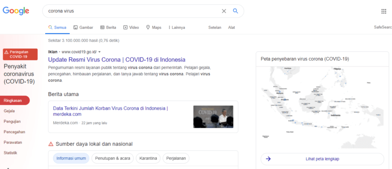 Halaman Google ini mencaput ringkasan informasi terbaru, Gejala, Lokasi pengujian ( lokasi rumah sakit terdekat), pencegahan, perawatan dan yang terakhir adalah statistik. tips bagi anda yang ingin melihat data statistik di propinsi cukup ketikan “coronavirus namapropinsi” . Trik ini juga bisa anda pakai untuk mencari statistik di negara tertentu ,misal “corona virus saudi arabia”.