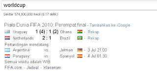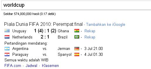 Google tidak mau ketinggalan dalam menyambut piala dunia, kita bisa mengakses halaman khusus di http://www.google.com/worldcup/. Disini kita bisa melihat stadium piala dunia 3D, petunjuk untuk melakukan pencarian piala dunia (realtime, uptodate termasuk jadwal dan skore),dan Extensi thema Google Chrome dari 32 negara yang ikut serta dalam piala dunia.