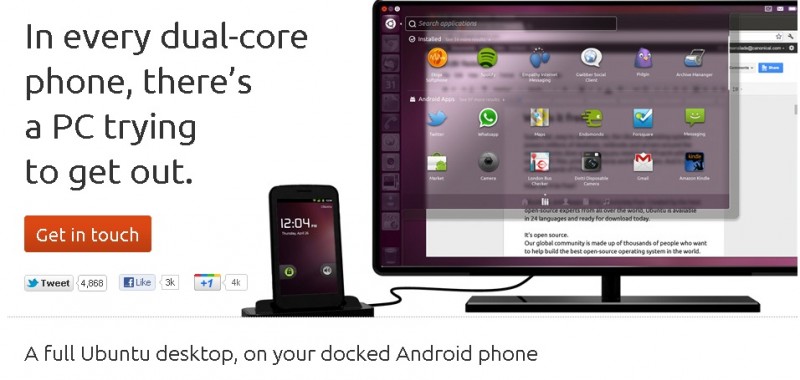 Canonical–perusahaan dibalik ubuntu– membuat proyek ambisius untuk membuat ubuntu bisa diisntall di android smartphone. Tentunya smarphone disini adalah smartphone highend dengan RAM yang besar dan Prosesor dual core yang cukup untuk menjalankan ubuntu desktop.