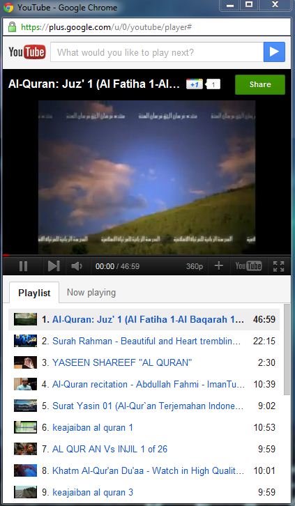 Akhir akhir ini, Google+ makin sering menambahkan update, setelah Game,sekarang anda bisa memutar video Youtube langsung dari Google+, caranya cukup mudah, klik icon youtube di sebelah kanan atas, dan carilah video yang menarik bagi anda, sebagai contoh saya mencari dengan kata kunci “al quran” otomatis Player Youtube akan muncul, bukan hanya menampilkan video yang sesuai, tetapi sekaligus membuat playlist tentang pencarian kita, dalam contoh diatas, langsung membuat playlist untuk murotall alquran.